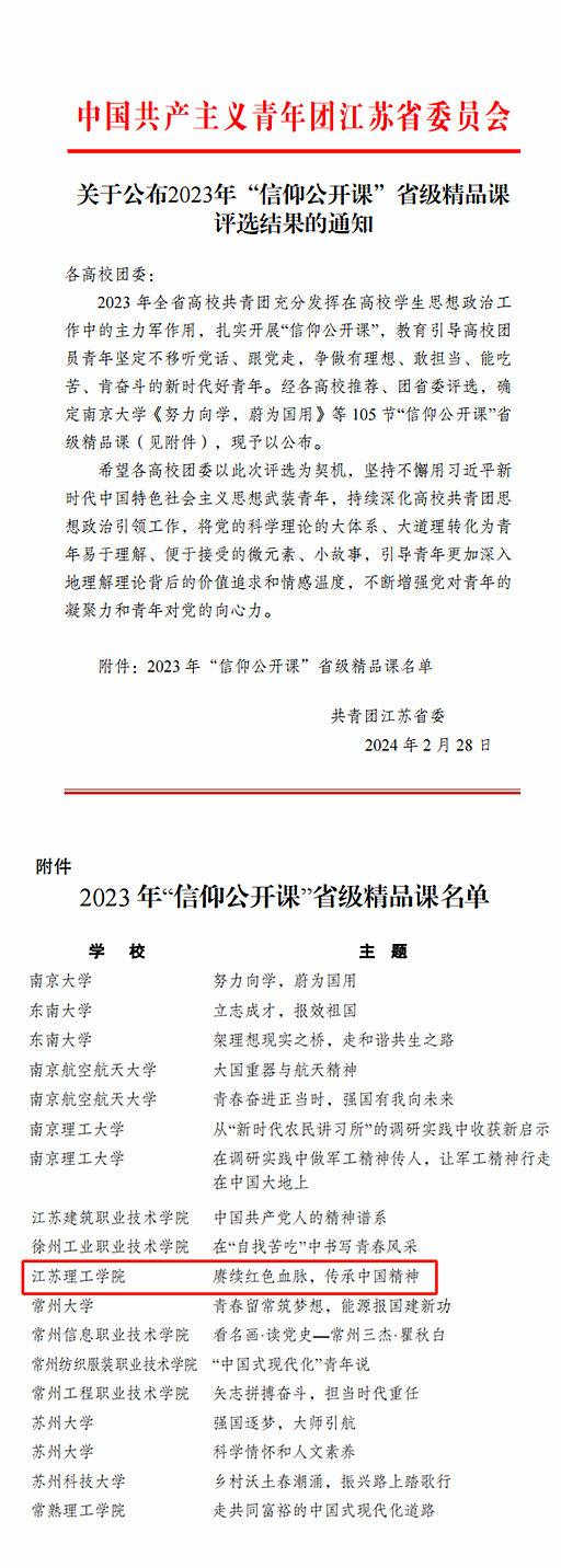 近日,共青团江苏省委公布了2023年全省高校“信仰公开课”省级精品课评选结果,我校日本女优 报送的作品“赓续红色血脉,传承中国精神”喜获“信仰公开课”省级精品课。