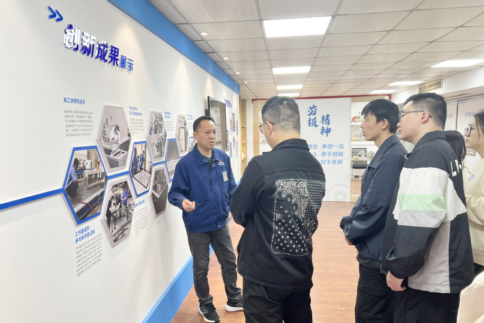在交流环节结束后,支部党员及团员们在新誉集团工作人员的带领下参观了生产车间和江苏省劳模严成工作室。在生产车间,同学们亲眼目睹了轨道交通产品的生产流程,感受到了现代工业制造的魅力和挑战。在劳模办公室,同学们与江苏省劳动模范、江苏省企业首席技师严成进行了亲切的交流,严成分享了他在新誉集团从一名普通焊工到拥有多张国际焊工证书的国际焊接技师的成长经历,他鼓励在场学生要做一行爱一行,勇于克服困难。同学们深刻感受到了劳模在工作中的敬业精神和奉献精神,并表示要以劳模为榜样,弘扬劳模精神,刻苦学习,为中国式现代化贡献青春和力量。