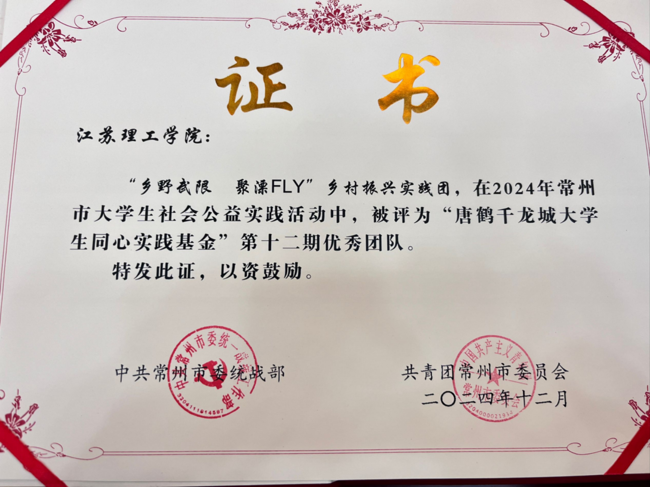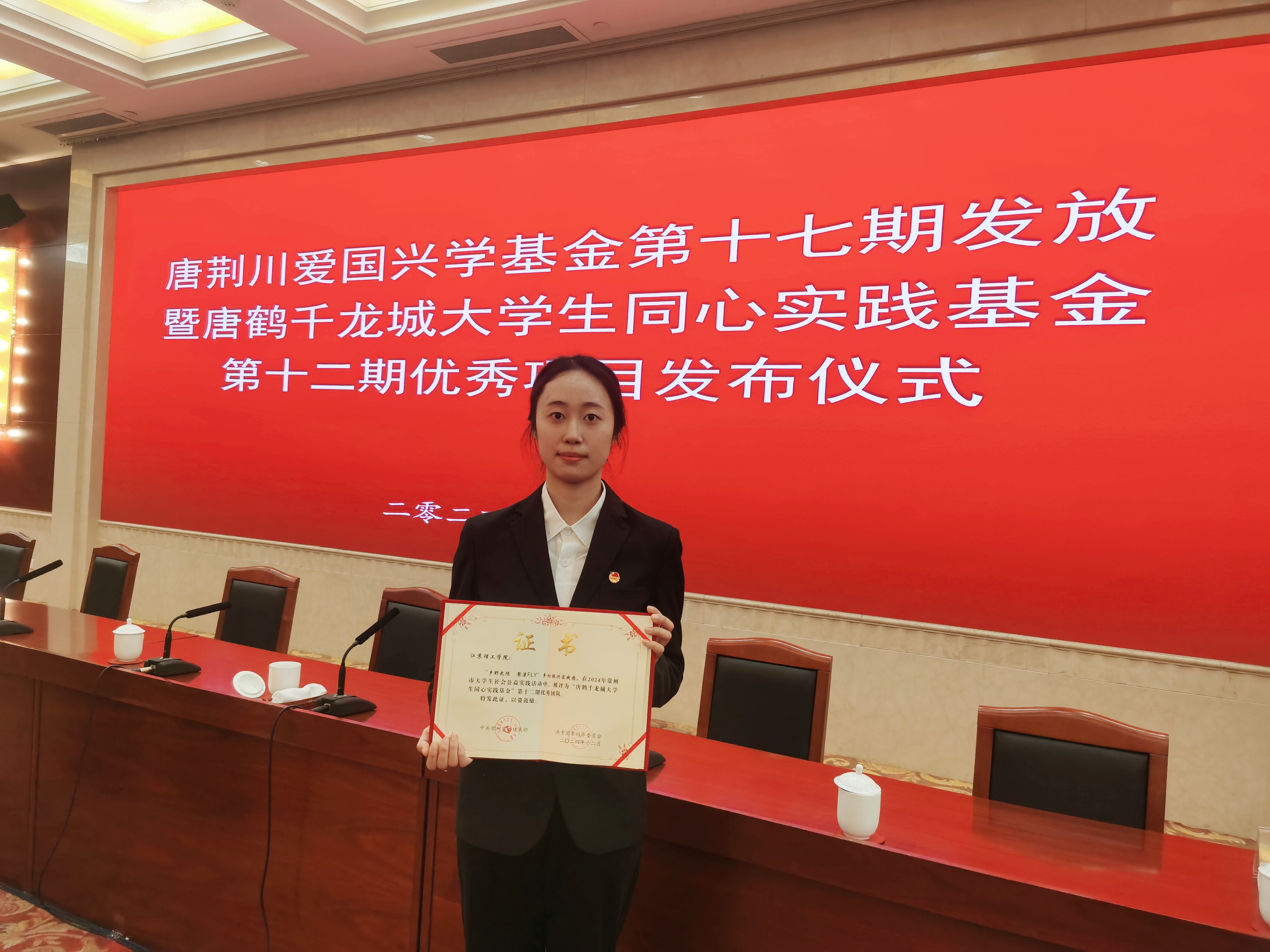 12月27日下午,唐荆川爱国兴学基金第十七期发放仪式暨唐鹤千龙城大学生同心实践基金第十二期优秀项目表彰活动在常州市行政中心星聚堂隆重举行。唐氏宗亲、市委统战部、团市委以及科教城等单位的领导出席活动,并为荣获第十二期龙城大学生同心实践基金优秀项目的团队代表颁发获奖证书。