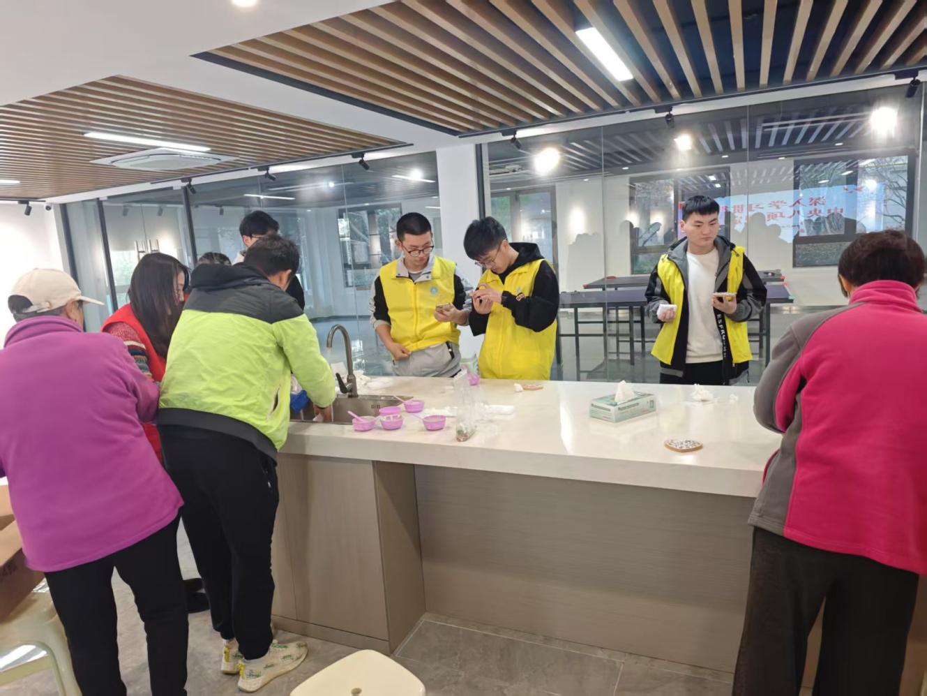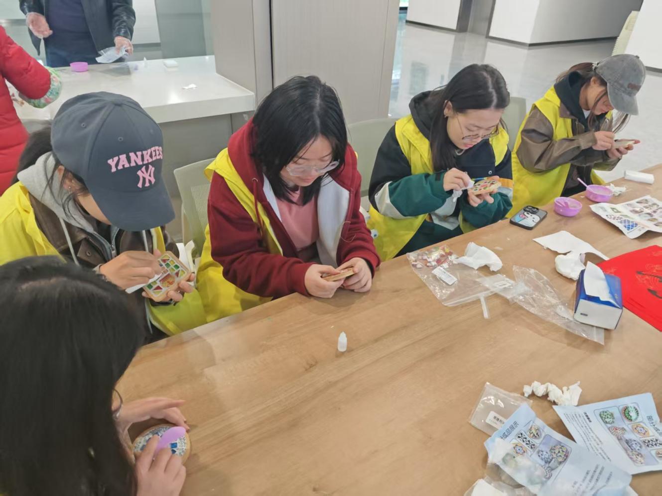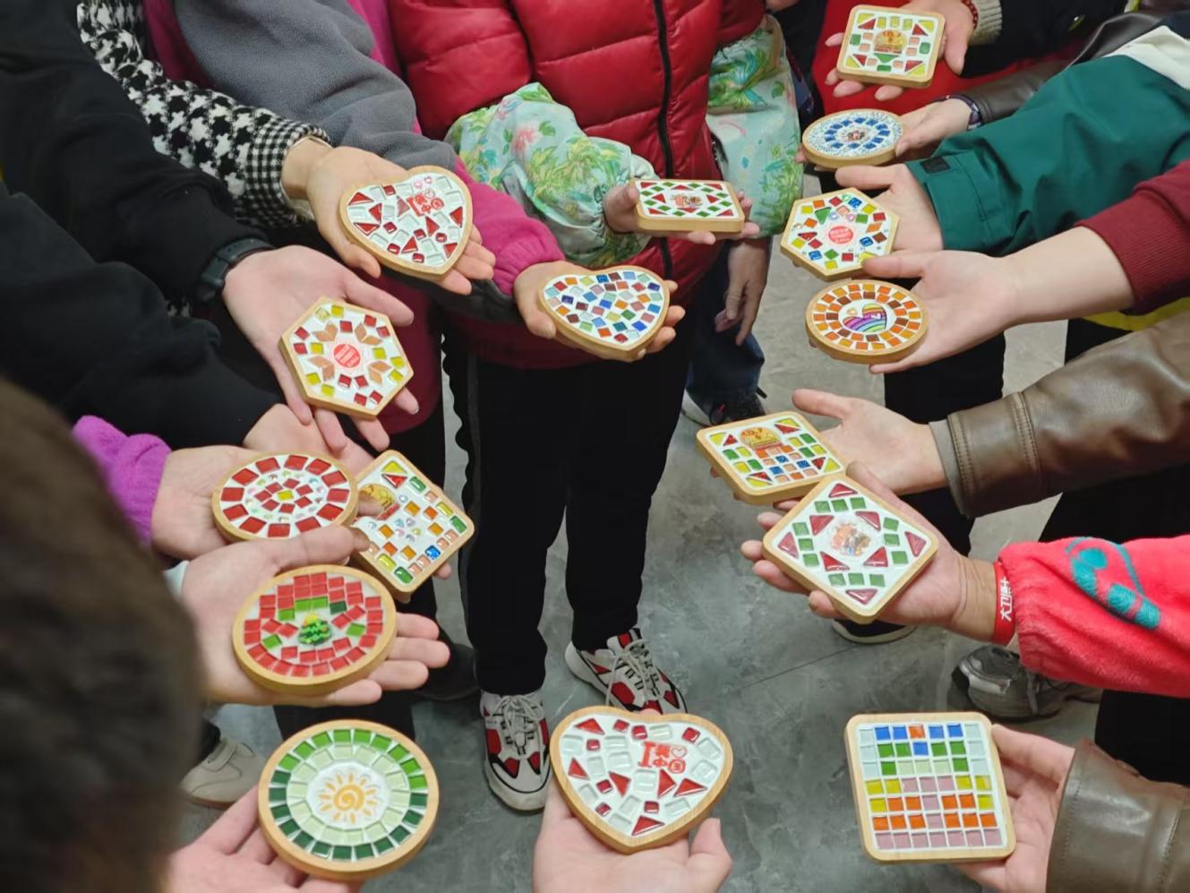 之后志愿者们发挥专业特长,运用数字化设计理念,和老人们共同制作手工马赛克杯垫。制作过程中,“追锋”志愿者们耐心指导居民们拼贴技巧。"奶奶,您看这样排列会更整齐"、"小朋友,我们可以用不同颜色拼出彩虹效果",志愿者们将严谨的工程思维融入手工创作,帮助居民们完成了一件件精美作品。