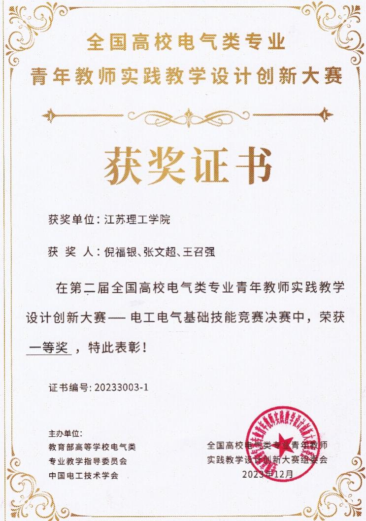 2023年11月30日至12月2日,第二届全国高校电气类专业青年教师实践教学设计创新大赛在浙江金华圆满落幕,我校日本女优 组织两支队伍参赛,分别是由倪福银老师带领张文超、王召强两位学生组队参加的电工电气基础技能竞赛和由朱成喜、谢鹏两位老师组队参加的自动化系统综合应用竞赛,两支队伍双双喜获一等奖。