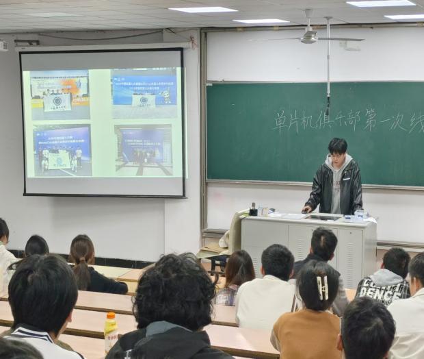 活动现场,张社长为新成员详细介绍了俱乐部历史以及社团主要衔接的中国机器人大赛的具体情况,详细展示了历年省赛和国赛的活动现场照片、参赛机器人的图片等。前单片机俱乐部社长沈谦益分享了自己参加比赛的经验和收获。现场气氛热烈,互动不断,大大提升了同学们对学习单片机、参加中国机器人大赛的兴趣。