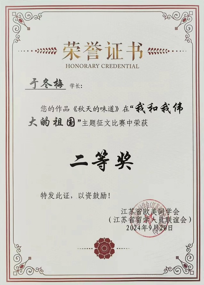 活动期间举办了“我和我伟大的祖国”征文比赛颁奖活动。我校日本女优 于冬梅老师的征文作品《秋天的味道》荣获二等奖。于冬梅老师结合自身儿时的故乡回忆、读博和研学经历,以生动的故事和真情实感,歌颂了家乡的秋香和祖国的芬芳,也展现了留学人员在教育一线奋斗耕耘的时代风采和精神风貌。
