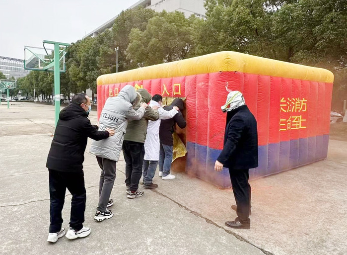理论知识学习结束后,紧张有序的实战演练拉开帷幕。实战演练分为逃生屋体验和灭火演习。参与教工在消防人员的组织下,用湿毛巾捂住口鼻,低姿前行,快速有序地通过满是烟雾,如同迷宫般的逃生屋。整个逃生过程紧张而不慌乱,充分展现了大家良好的应急反应能力。