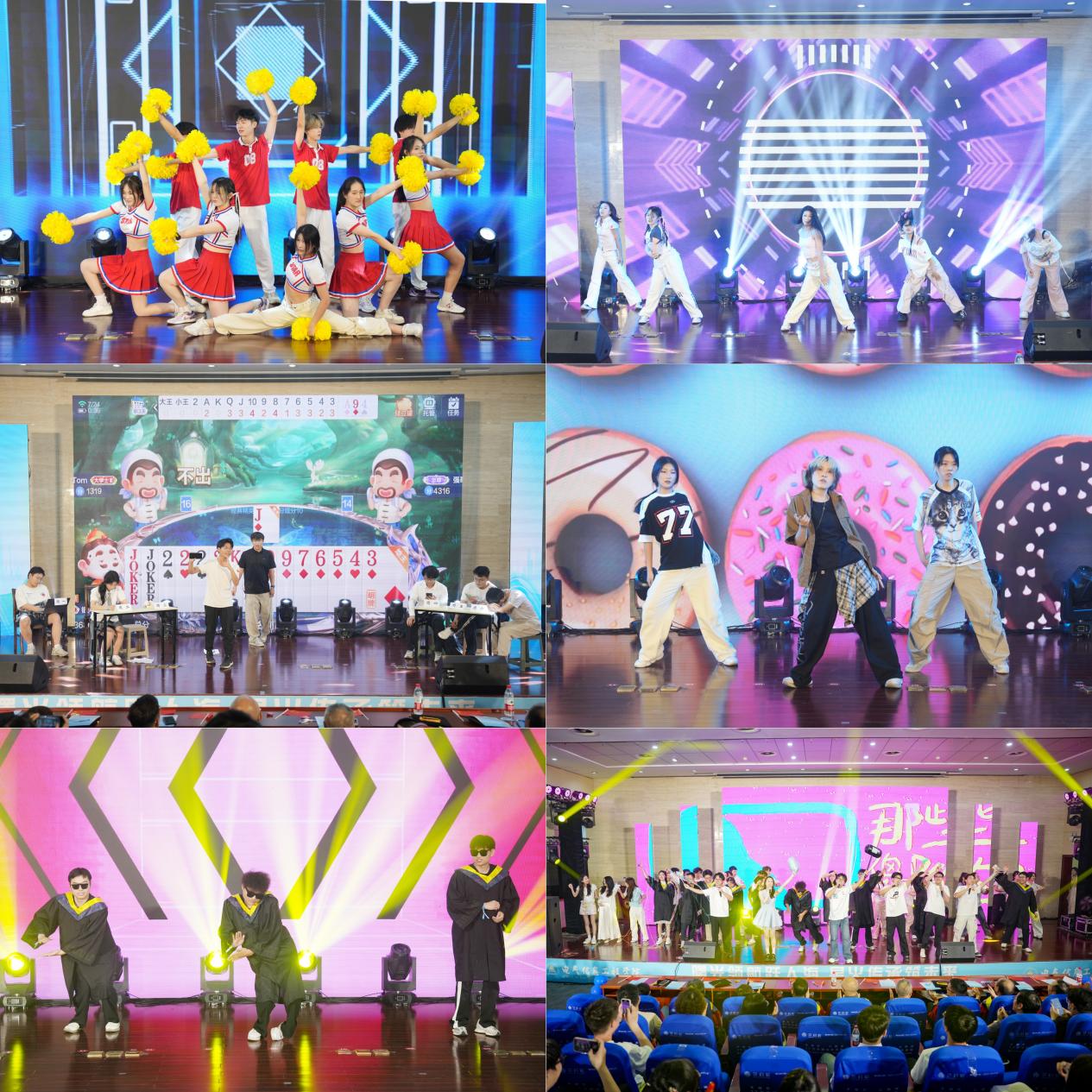 毕业典礼篇章由沙天雨、刘旭主持,精彩节目轮番上演。院啦啦操社团带来《电流舞动青春啦啦操》,活力舞姿展现青春风貌;学院领导高凯、俞洋演唱的《朋友别哭》抒情感人引发全场欢呼;《爵士舞蹈串烧》《消失的周日》等节目,诉说同窗情谊与校园回忆;《HIPHOP舞蹈》《科目三》点燃现场热情,《像你这样的朋友》传递不舍与祝福,舞台上的青春风采,是毕业生校园生活的生动缩影。