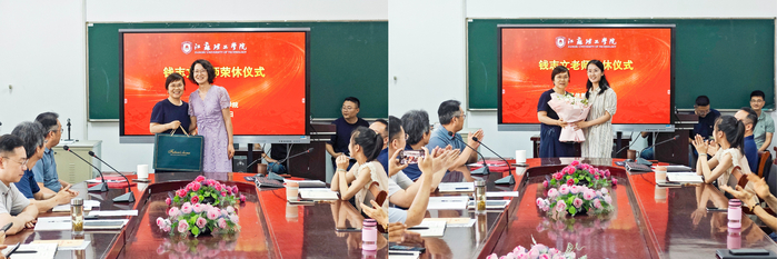 院长俞洋为钱老师颁发“终身教授”荣誉证书,工会主席张芬、青年教师舒黎代表全体教师为钱老师赠送纪念品、献上鲜花。