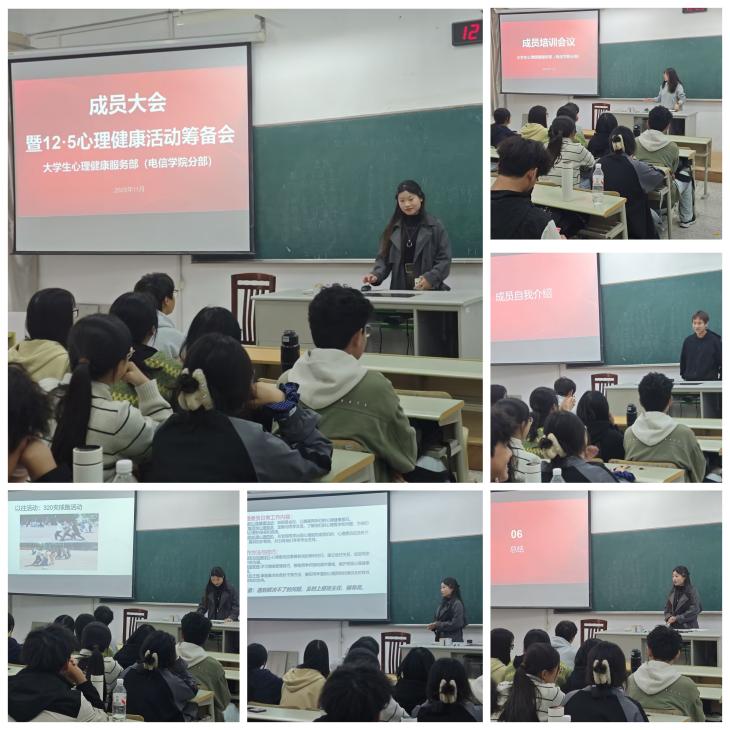2025年11月3日,大学生心理健康服务部(电信学院分部)于65-107教室召开成员大会暨12·5心理健康教育活动筹备会议,旨在欢迎新成员、总结过往工作、部署未来规划,并加深成员间的了解与情谊。协会指导老师闵钗、全体新老成员共同出席此次会议。